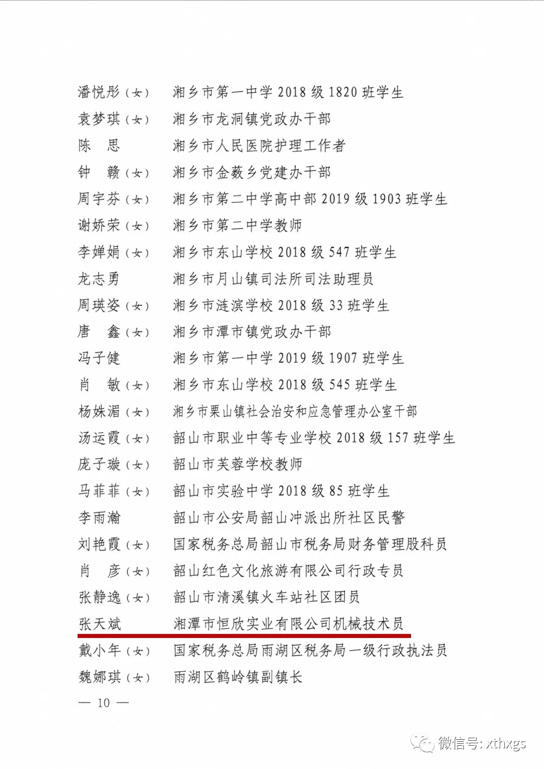 【湘潭恒欣】张天斌被授予"湘潭市优秀共青团员"
