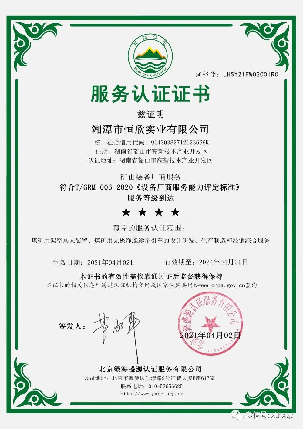 矿山装备厂商服务(四星级)认证是由北京绿海盛源认证服务有限公司根据T/GRM008-2020《设备厂商服务能力评定标准》,对【湘潭恒欣】的服务能力进行现场认证。审核专家以公正、专业的态度通过现场考察、交流和查阅相关资料后,对【湘潭恒欣】的服务能力进行了全面的评价。