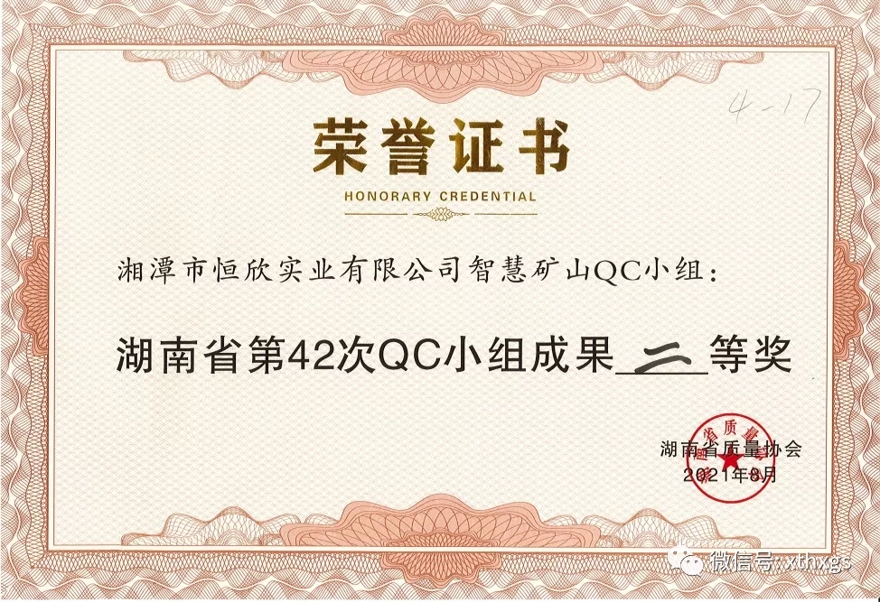 【湘潭恒欣】报送的三个QC小组成果《一种液压制动卡轨车的研发》(动能无限QC小组)、《提高液压猴车运行速度的稳定性》(液控技术QC小组)和《矿山装备工业互联网管控平台的研发》(智慧矿山QC小组)在发表中荣获了两个一等奖和一个二等奖,充分体现了【湘潭恒欣】推行全面质量管理以来,全员积极参与质量改进与创新,不断提高企业质量管理水平和产品质量,助力企业持续高质量发展。