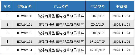 【湘潭恒欣】再获13个防爆柴油机单轨吊机车安标证