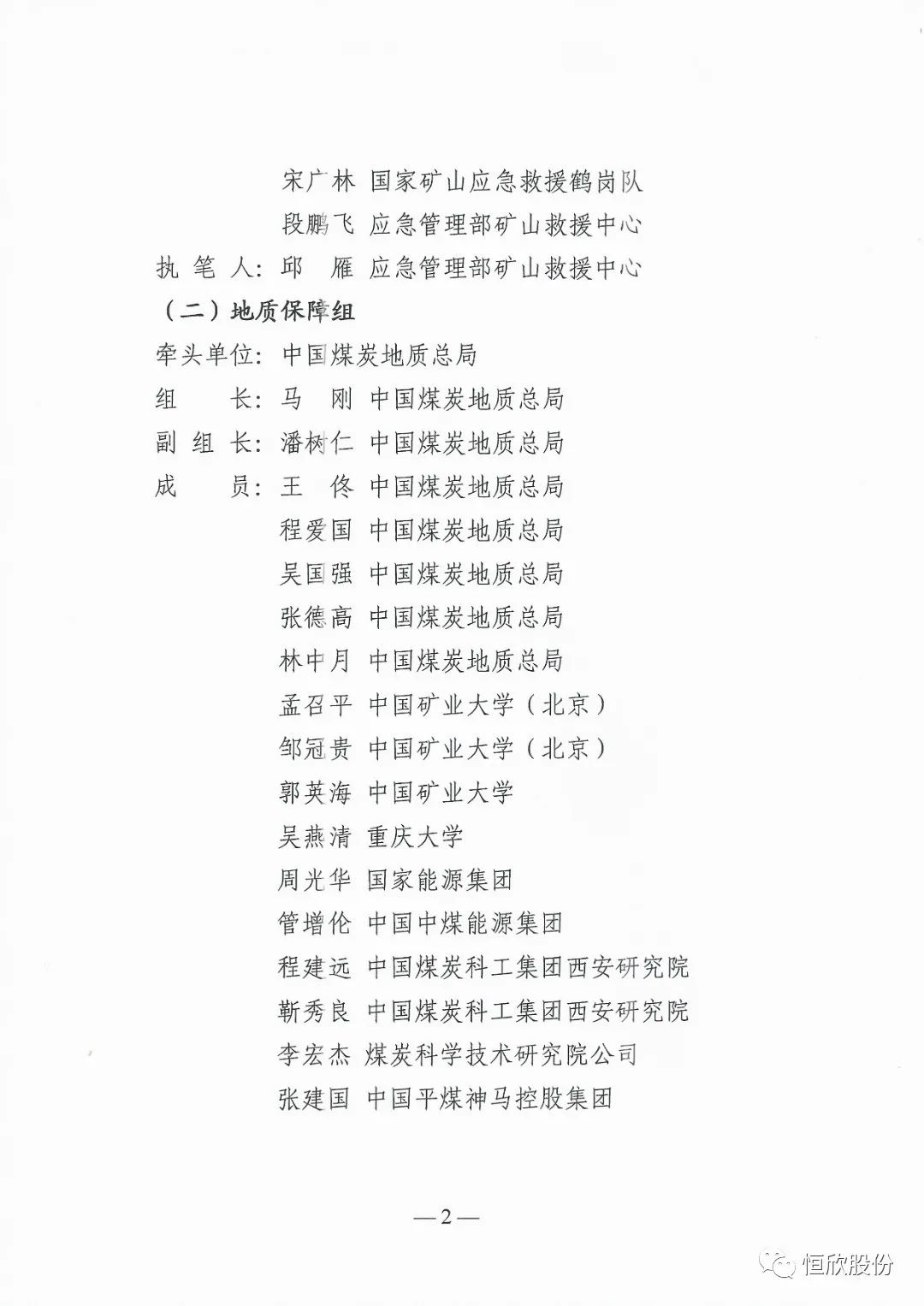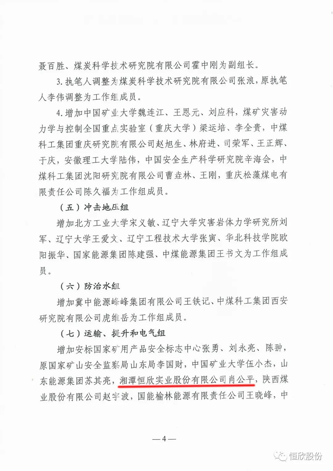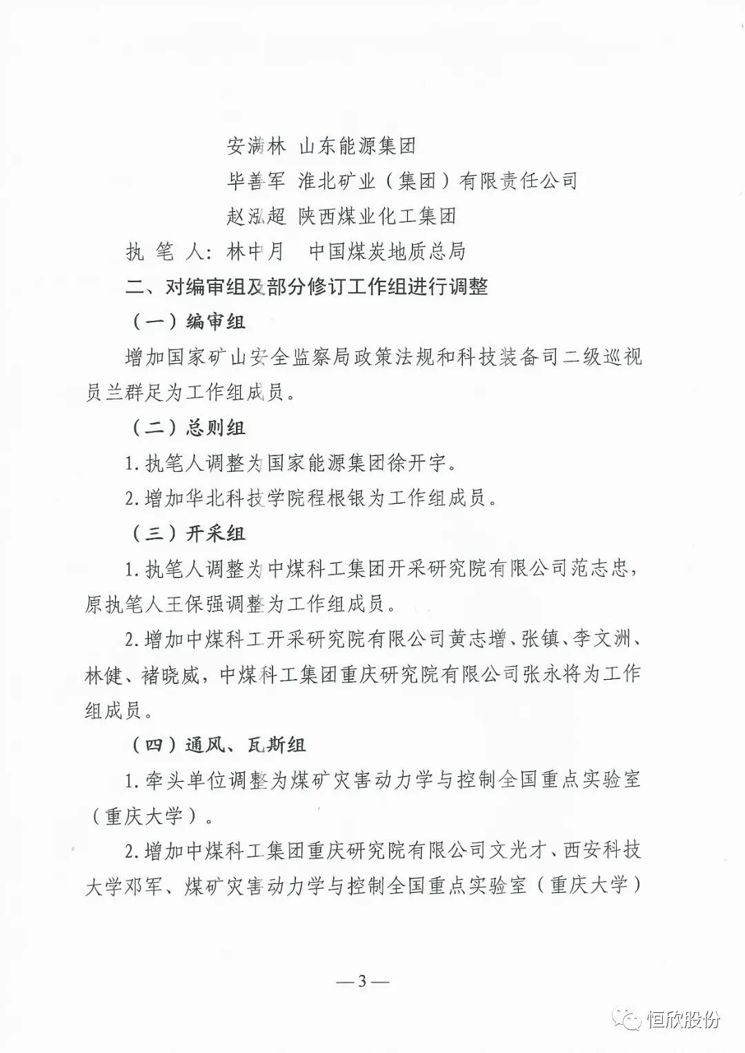 国家矿山安全监察局为进一步加强《煤矿安全规程》修订组织工作,将增加和调整的组织机构进行公示,【恒欣股份】加入《煤矿安全规程》修订运输、提升和电气组机构名单中。【恒欣股份】将不遗余力为健全完善矿山安全机制,从源头上防范化解煤矿重大安全风险贡献一份力量。