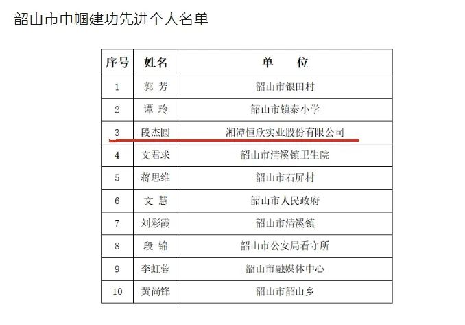 在韶山市第八次妇女代表大会上,表彰了韶山市妇联印发《关于表彰韶山市“三八红旗集体”“三八红旗手”“巾帼建功先进个人”的决定》,【恒欣股份】人事总监段杰圆荣获韶山市“巾帼建功先进个人”荣誉称号!她曾先后获评全国专利信息实务人才、工业经济运行监测先进个人、韶山高新区优秀共产党员、湖南省第42次QC小组成果一等奖等荣誉。