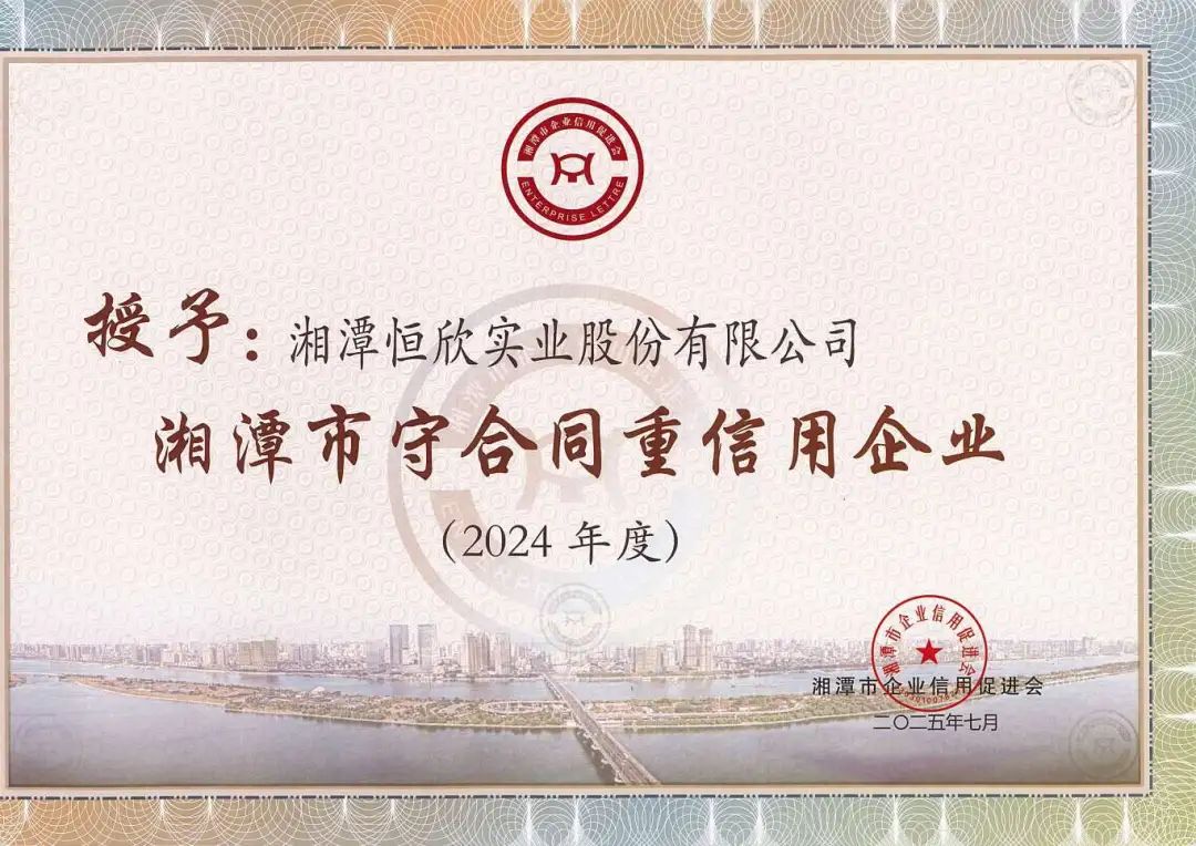 喜讯!【恒欣股份】近日成功获评“2024年度湖南省守合同重信用企业”和“2024年度湘潭市守合同重信用企业”!这是公司连续第十二年荣获此项殊荣。