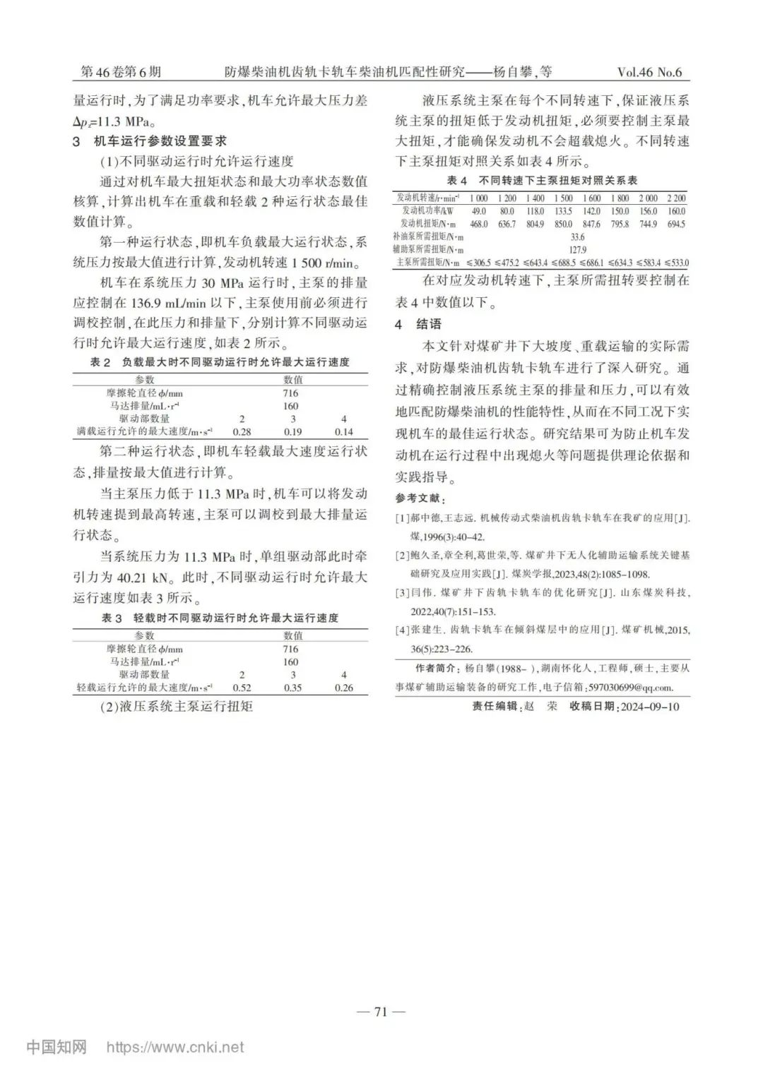 研究结果表明,通过控制不同机车型号的大负载运行速度及主泵的最大扭矩,能够有效避免机车在运行过程中发生发动机熄火的情况。这项研究为防爆柴油机齿轨卡轨车的设计和应用提供了理论依据,同时为其在煤矿井下大坡度、重载运输中的实际应用提供了技术支持和指导。