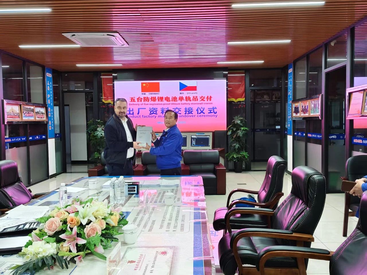 在为期三天的行程中,外商技术团队深入生产车间,全程参与产品出厂的检测检验,对设备性能、装配工艺、随机技术资料、危险品包装及出口欧洲的各种认证进行了严格核验,终于在3月28日,5套防爆锂电池单轨吊产品正式交付,并在韶山市新闻媒体的共同见证下,在生产现场举行了交付仪式。帕维尔·普拉泽克先生在仪式后接受专访时表示:“【恒欣股份】的产品技术持续精进,服务专业高效,去年合作成果赢得客户一致好评。此次追加订单后,我们计划全面深化合作,【恒欣股份】将成为欧洲市场的标杆品牌。”
