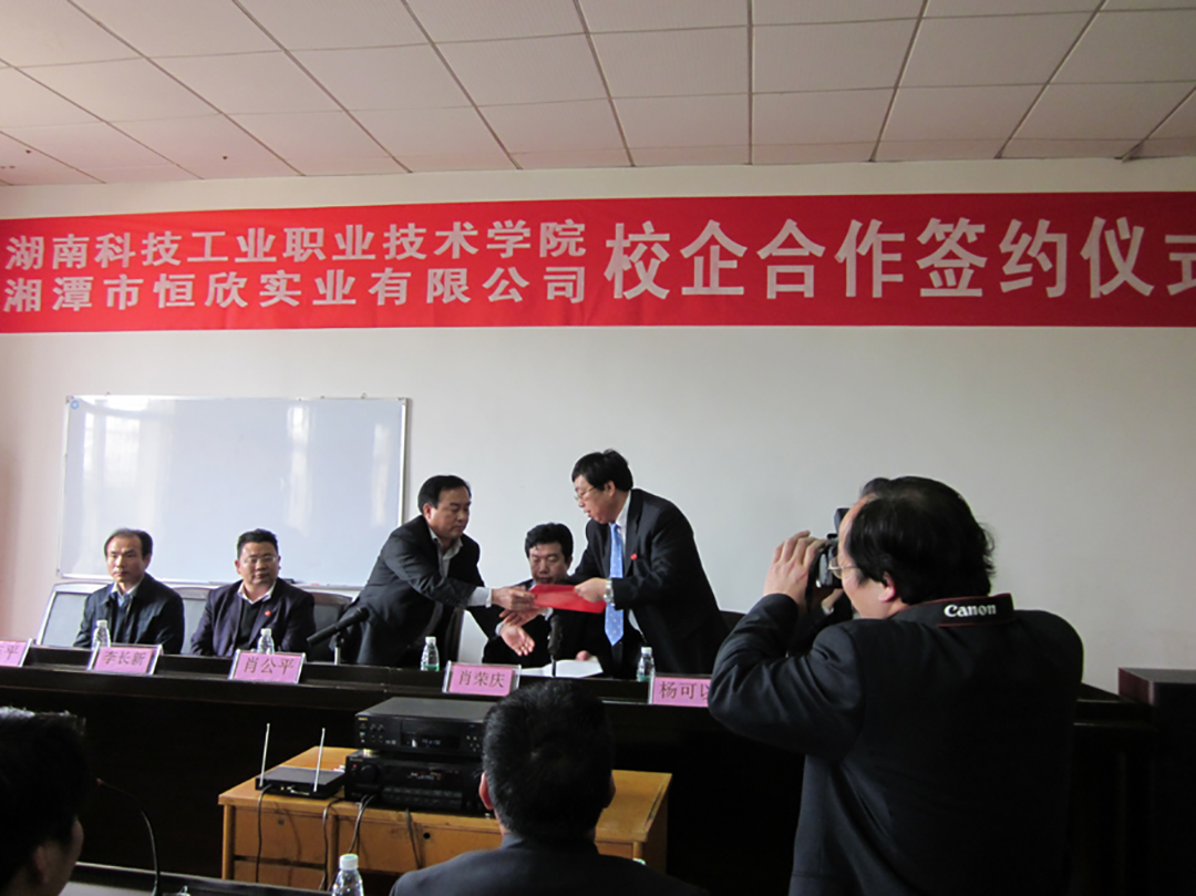 2011年3月31日,在韶山市领导的见证下,我公司与湖南科技工业职业技术学院签订了校企合作协议书,校方为我公司人才培养基地,为我公司培养所需求的人才;我公司在校方设立“恒欣”班,并为其提供奖学金和爱心基金。