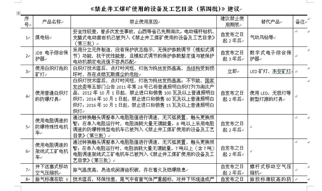 《禁止井工煤矿使用的设备及工艺目录(第四批)》建议