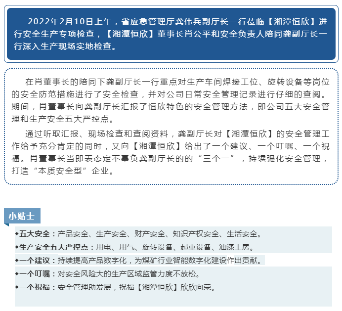 省应急管理厅龚伟兵副厅长带队莅临【湘潭恒欣】检查企业复工复产安全防范工作
