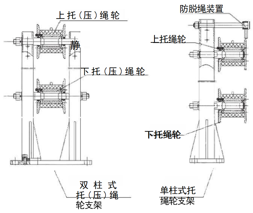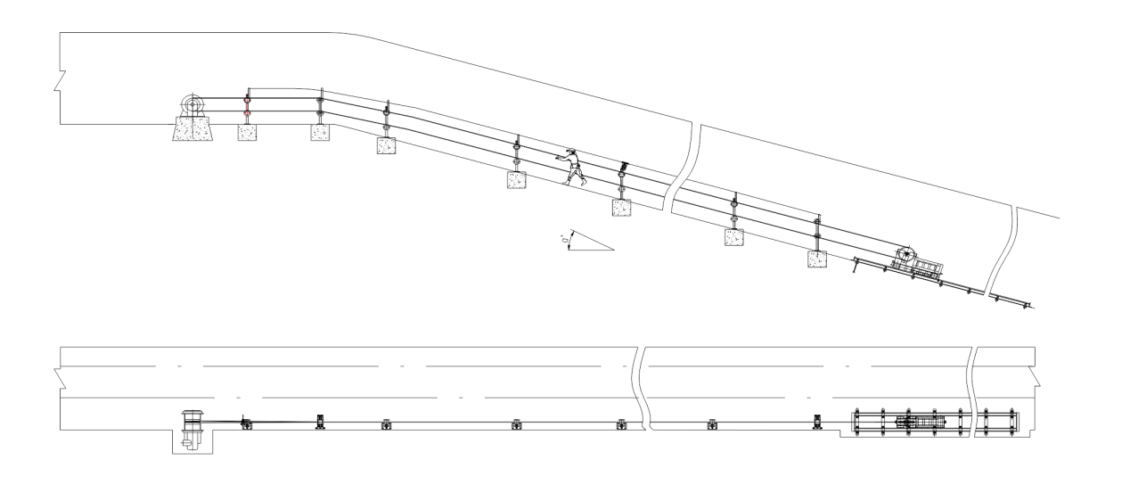 无极绳绞车带动钢丝绳无极循环运行,行人将卡绳棒卡住上山运行的钢丝绳,并由上山运行的钢丝绳将人拖动向上助力上坡,从而减轻矿工斜井上坡时的体力消耗,但下坡时禁止使用助行器。