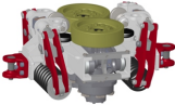 摆臂式半马达驱动装置由液压半马达 、行走轮 、摩擦轮 、制动装置 、 左右摆臂 、 夹紧油缸等组成; 其采用摆臂支架结构 ,通过 中 间短轴连接摩擦轮 ,额定牵 引 力30KN ,设有工作制动器和安全制动器 ,制动力都为45kN