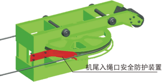 在驱动轮、迂回轮与钢丝绳入口处,安装了安全防护装置,防止设备运行中有异物导入轮体而造成掉绳或人身伤害事故的发生。