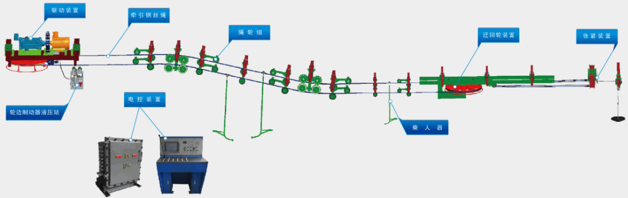 矿用架空乘人装置主要是用于斜井或平巷的人员运输。它主要由驱动装置、托绳装置、牵引钢丝绳、乘人器、迂回轮装置、张紧装置、安全保护装置及电控装置等组成。运输原理是将钢丝绳安装在驱动轮、绳轮组和迂回轮上,经张紧装置张紧牵引钢丝绳后,由驱动装置输出动力带动牵引钢丝绳作无极循环运行,挂在牵引钢丝绳上的乘人器随钢丝绳上行或下行,从而实现输送人员的目的。