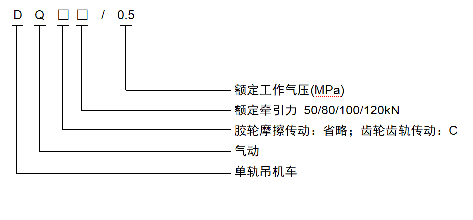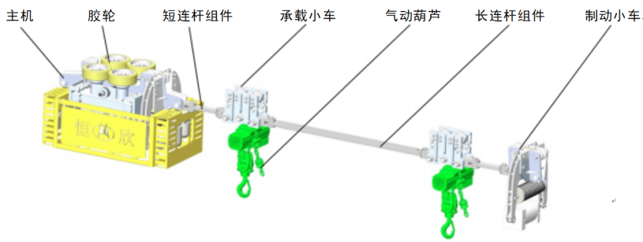 矿用气动单轨吊机车主要由驱动装置 、承载小车 、制动车 、气动葫芦 、拉杆 、气动系统 、安全保护等组成 。 以压缩空气为动力源 ,驱动气动马达带动胶轮或齿轮在轨道上运行 。适用于短程区间调度或掘进巷道的接力运输;设备不产生废气 ,更适合通风条件差的工况 。通过操作手柄跟随设备运行作业 。主要用于煤矿井下采掘工作面上下端头巷道超前支护的物料 、设备的运输 ,也可用于井下其它需要短距离运输的工况。