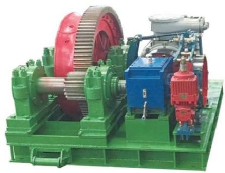 主要由电机、减速机、联轴器、制动器、齿轮齿圈、驱动轮、安装底座等组成。驱动轮采用并列双摩擦轮衬的结构方式,有效地增加钢丝绳与绳衬的围包角,避免钢丝绳打滑。适用于负载牵引力大的使用工况。