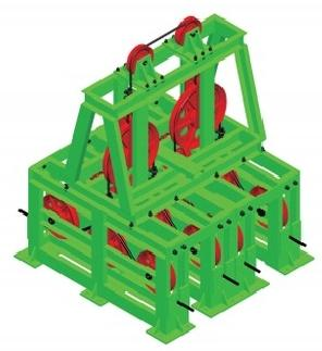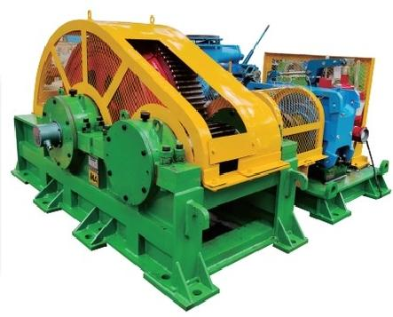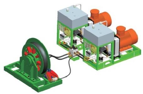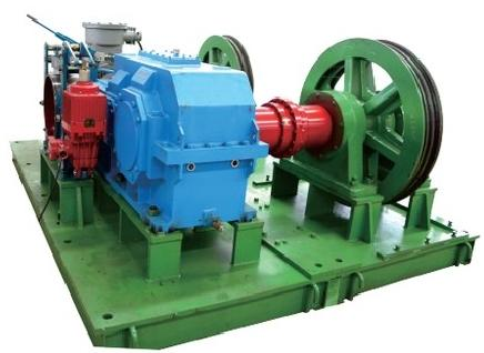 机械双轮驱动装置主要由电机、手动制动器、减速机、三槽式主轮和二槽式副轮(即“三槽对二槽”或“四槽对三槽”)、工作制动器、导绳装置等组成,主要适用于大负载牵引力的使用工况。