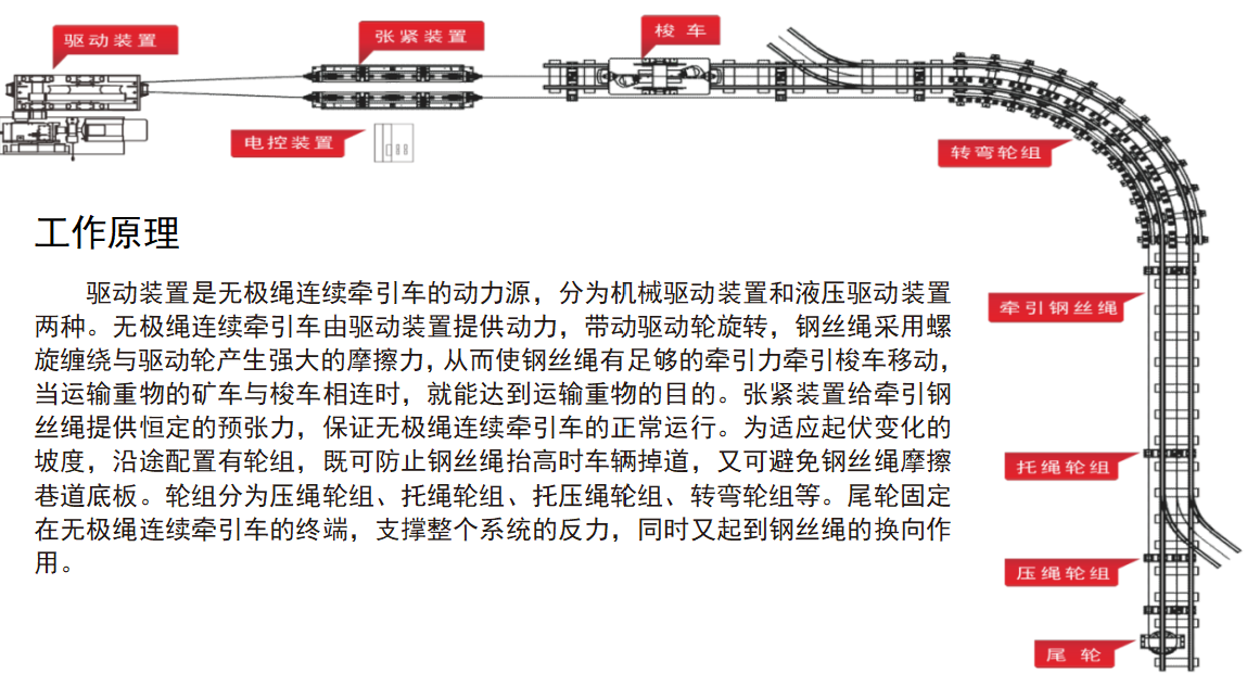 表示:额定牵引力为80kN、电机功率为90KW、齿轮变速、重锤张紧的无极绳连续牵引车。