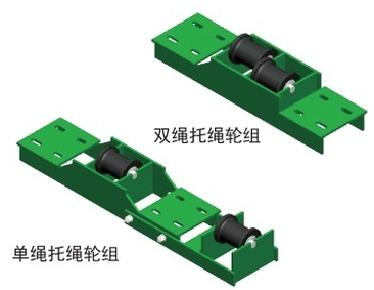 为适应起伏变化的巷道,避免钢丝绳摩擦巷道底板,在线路中的平巷或上变坡点安装托绳轮组,起到减小磨损,延长钢丝绳使用寿命的目的。根据钢丝绳在轨道的布置方式分为双绳托绳轮组和单绳托绳轮组两种。
