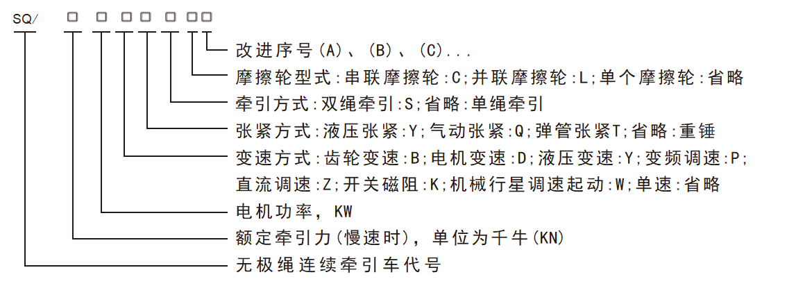 表示:额定牵引力为100kN、电机功率为110KW、采用液压调速、液压张紧的无极绳连续牵引车。