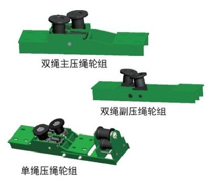 由于巷道条件复杂,线路中会出现变坡,钢丝绳在往复运转的过程中会出现悬空或者脱离运输轨道的现象,因此需要使用压绳轮组对钢丝绳定位,以保持运输过程中钢丝绳的稳定。根据压绳轮的结构形式分为主压绳轮,副压绳轮,根据钢丝绳在轨道内的布置方式分为双绳主压绳轮,双绳副压绳轮,单绳压绳轮。